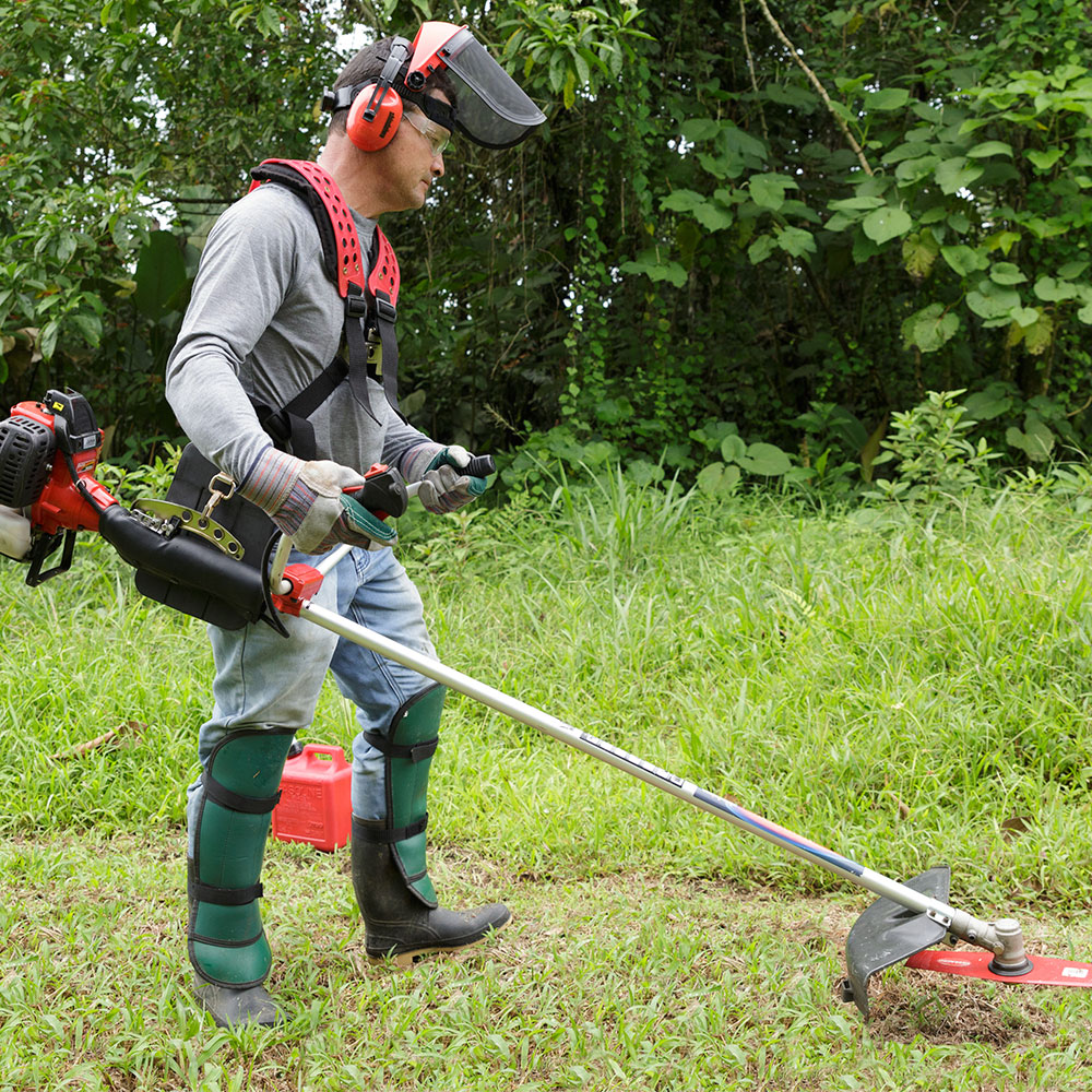 Con la Guadaña Shindaiwa Eje Giratorio B450, 41,5 cc puedes equipar el cabezal Polycut de nylon para césped fino, el disco sierra para troncos pequeños, guantes antideslizantes y gafas de seguridad. También es recomendable un arnés profesional acolchado para mejorar la comodidad en jornadas prolongadas. -